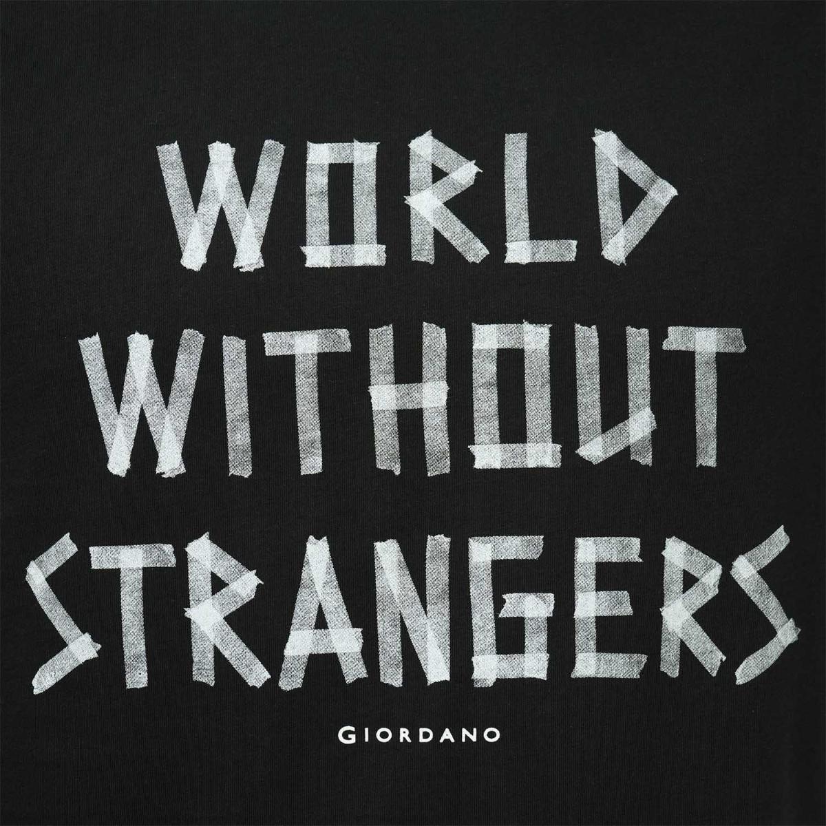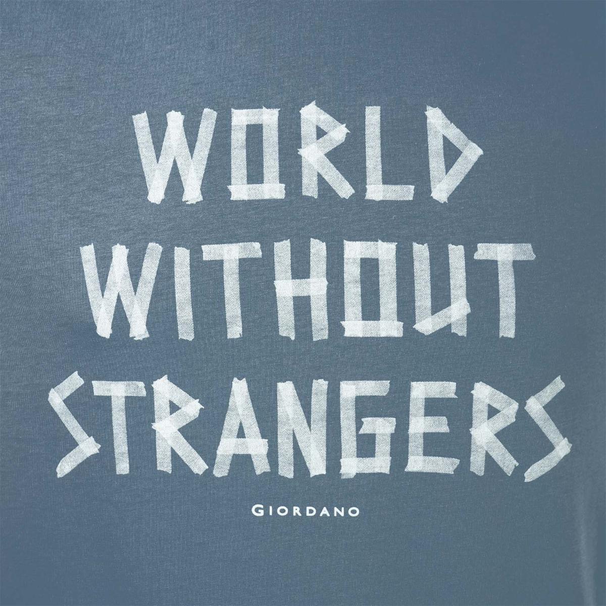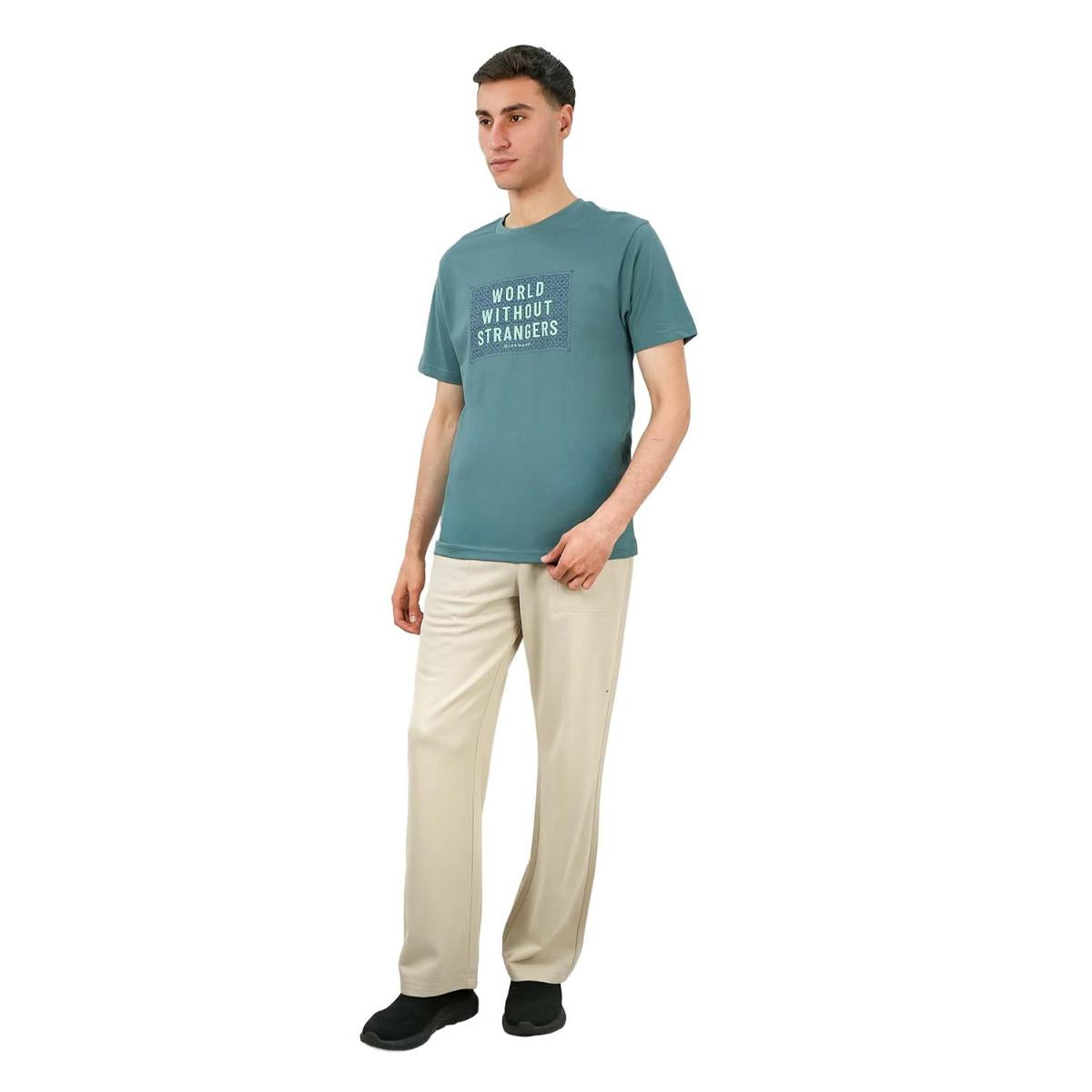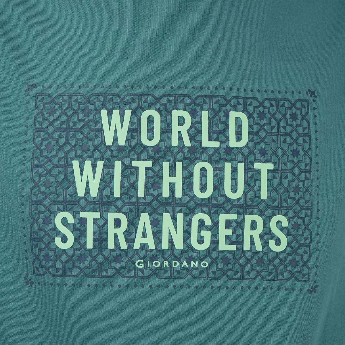• تي شيرت رجالي مطبوع عليه عبارة "عالم بلا غرباء" - قصة ضيقة، رقبة دائرية، قطن