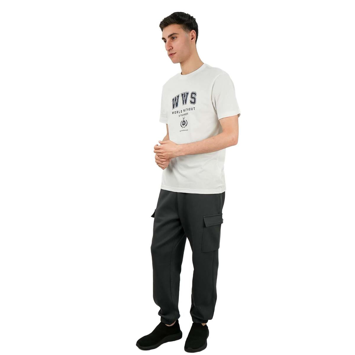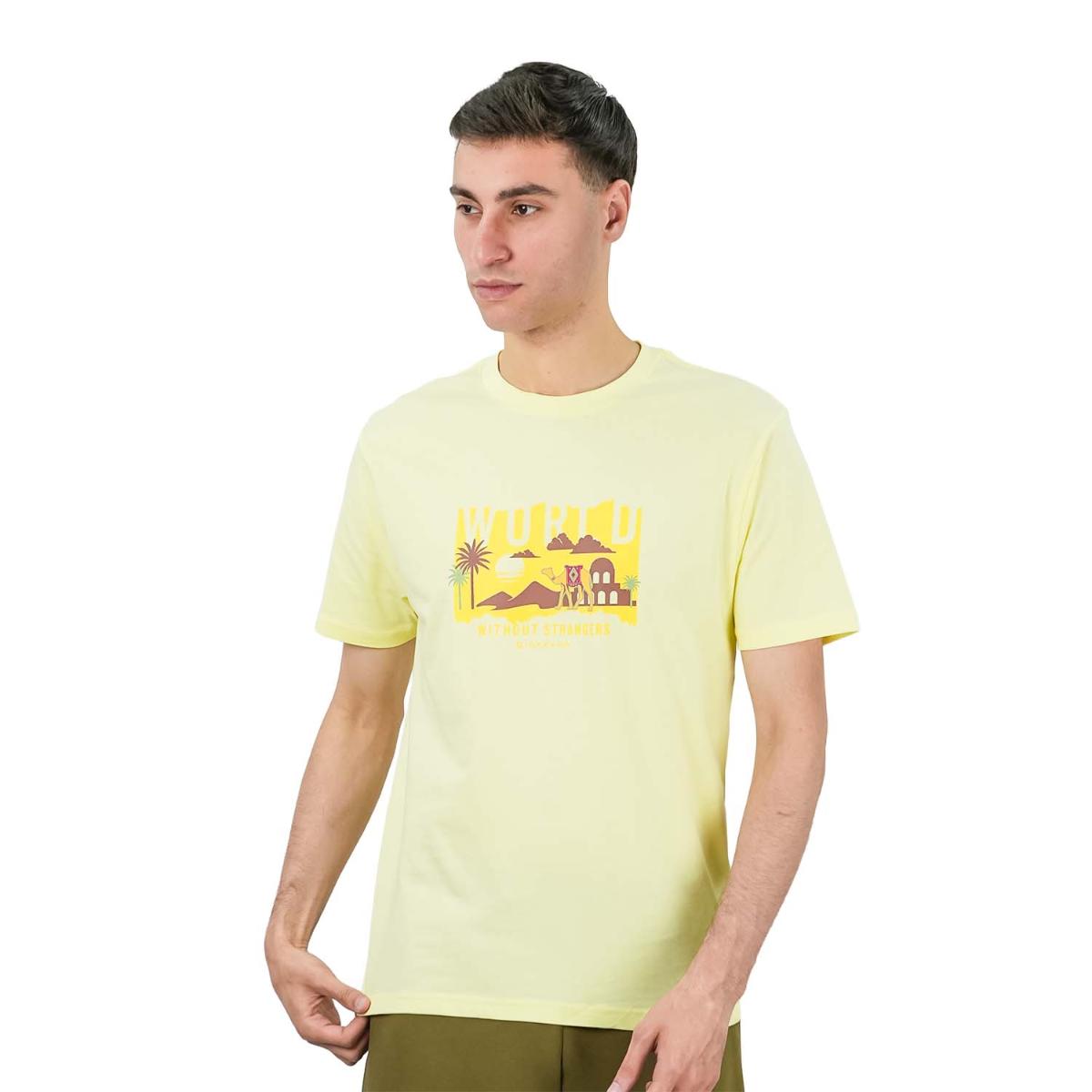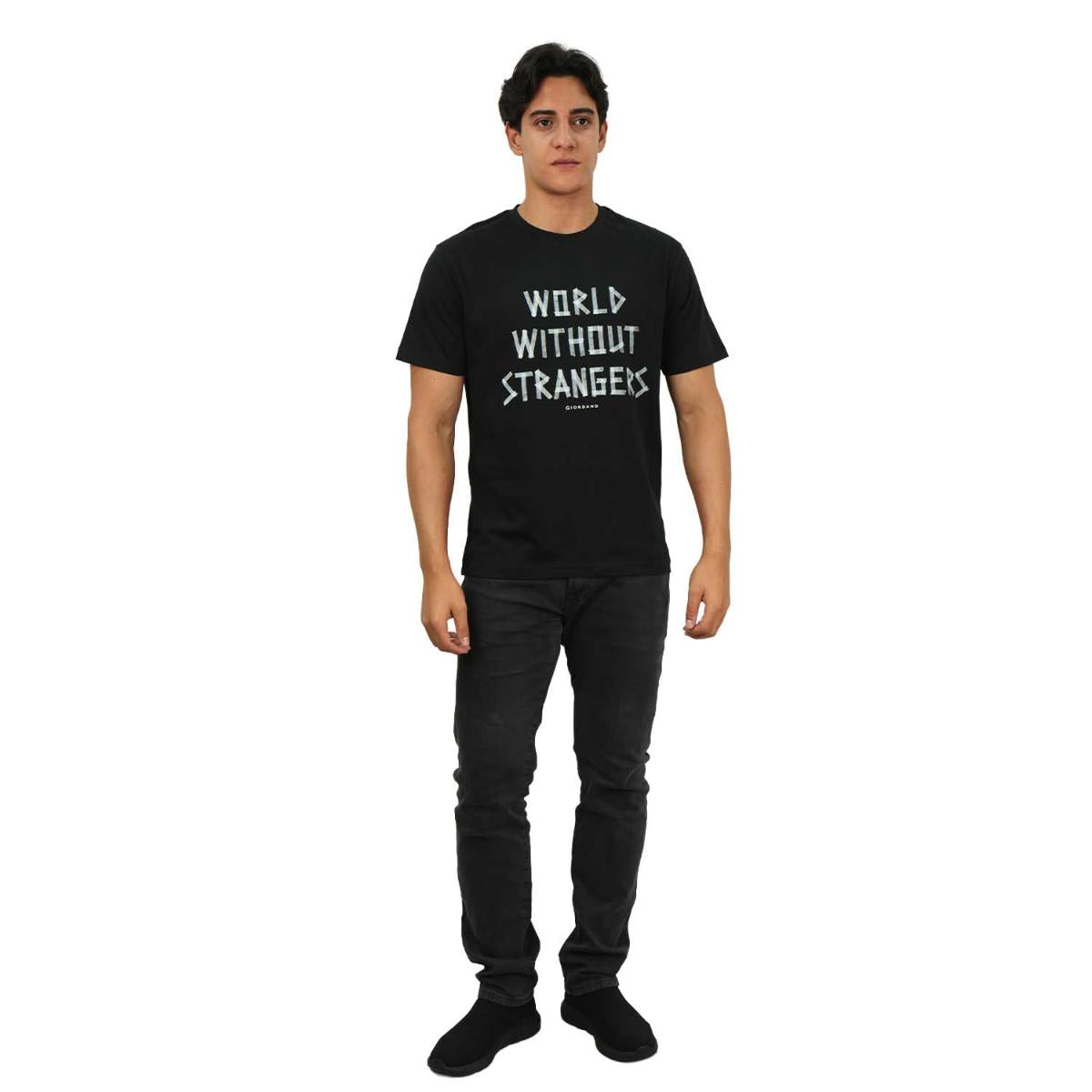 تي شيرت رجالي مطبوع عليه عبارة "عالم بلا غرباء" - قصة ضيقة، رقبة دائرية، قطن